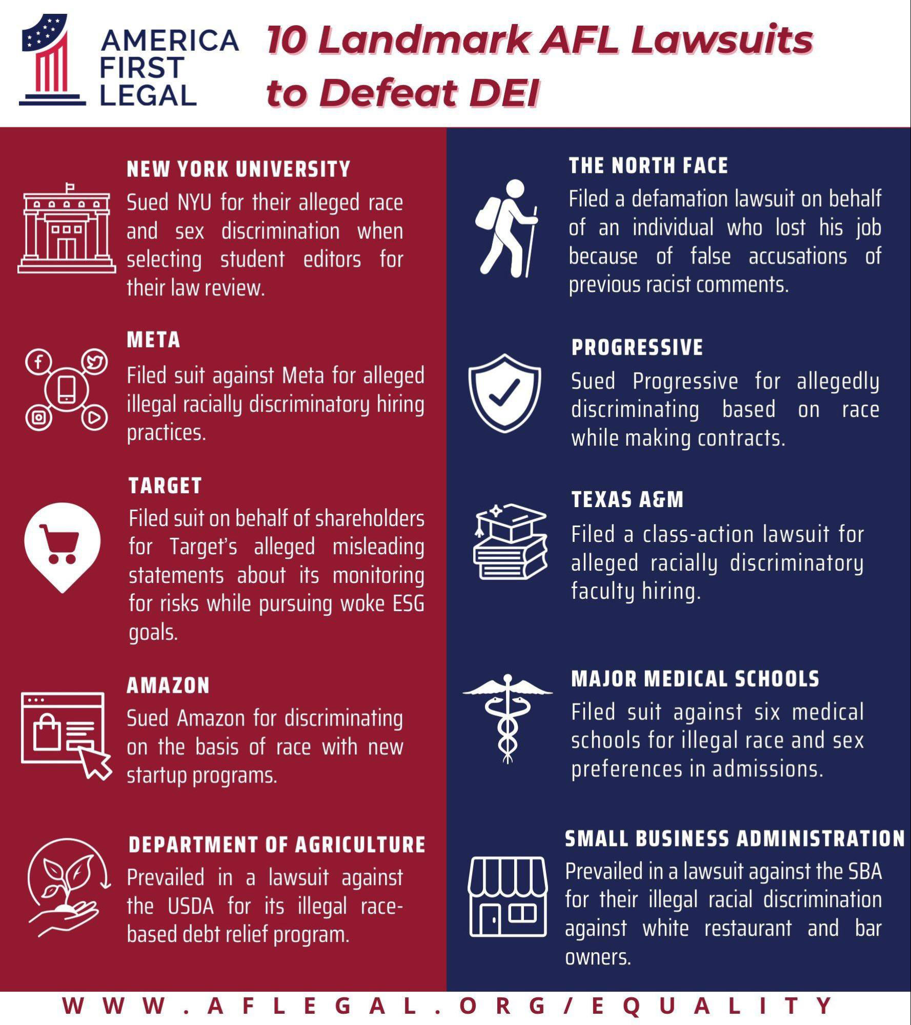 Interestingly, one of the key factors of ESG is compliance with laws and ethical standards in business operations. Racial fascism certainly is not ethical, but is it even legal? According to Stephen Miller, founder of America First Legal, DEI is racism, and it is illegal. His firm is fighting this form of discrimination, and he invites victims of DEI to contact him immediately. Here is an overview of some of the cases they are working on: