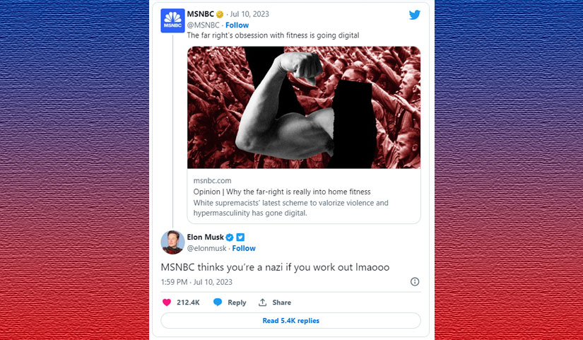 Yes–you read that correctly. This was an actual tweet from Elon Musk (well, he did add an “lmaooo” at the end) in response to a tweet from MSNBC, stating “The far right’s obsession with fitness is going digital.” In all fairness, it was an “opinion” tweet, with the subhead reading “Why the far-right is really into home fitness. White supremacists’ latest scheme to valorize violence and hypermasculinity has gone digital.” Elon wasn’t the only one cashing in on the fun of the absurdity of this tweet. Many others joined in, including Joe Rogan, a self-styled liberal and lifetime fitness fanatic, tweeting, “Being healthy is ‘far right.’ Holy f–k.”