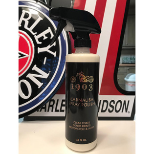 1903 Spray on Polish is a pure carnauba spray wax that is easy to apply and easy to remove. Other Liquid waxes on the market simply do not measure up to 1903 Spray on Polish. They do not provide the deep shine that turns a good paint job into a brilliant paint job. Unlike most waxes available today, 1903 Spray on Polish contains no cleaners, powders, abrasives, or PTFE sealants. This is crucial to protecting the finish on your motorcycle or car because products containing cleaners, powders, or abrasives remove some of your vehicle's finish every time you wax.