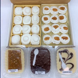 Holiday Farms also offers Peanut and Pecan Brittle, made with Texas pecan or Peanuts. Our brittle is crunchy, sweet, and delicious and is available in seasonal gift tins or clear plastic deli containers. Old fashioned Peanut Patties are another sweet favorite, also made the old-fashioned way in small batches on the stove. These sweet pink candies are similar to soft peanut brittle, loaded with peanuts, and are available in seasonal gift tins or clear plastic deli containers. Be careful, though—once you start on these, putting them down is hard. Chewy Pralines are a Texas treat offered by Holiday Farms. Rich, chewy and delicious, like a caramel with pecans, these chewy pralines are hard to beat. These decadent, chewy treats will keep you coming back for more and are made with real butter, brown sugar, Texas pecans, and sweetened condensed milk.