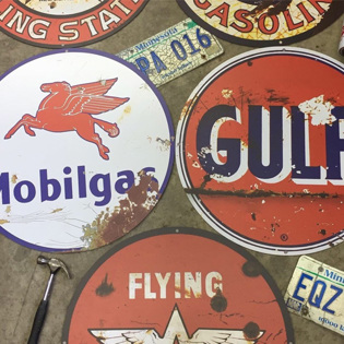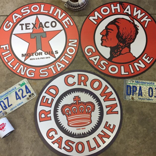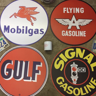 These old car restorations are funded with various cool-car-guy man cave retro gasoline signs. We offer gasoline round metal automotive retro signs measuring 2 feet in diameter, 18 gauge, and 3mm in thickness. The material is aluminum composite which is very durable and ridged! These garage signs have been reproduced and are perfect for your garage, home office, or anywhere your wife lets you put it in the house.