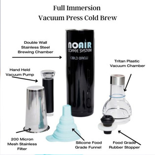 Our patent-pending Full Immersion Vacuum Brewing technology draws in amazing complex flavors while preventing oxidation. It brews fast, prevents stale aftertastes, and stays vacuum-fresh for the entire brew cycle. Cold brewing with a NoAir produces the freshest, most flavorful cold brew you have ever tasted - or your money back. It brews in half the time due to the vacuum accelerated brewing method (8 hours versus 16 hours) and stays vacuum-sealed fresh for the entire brew cycle. The NoAir Coffee System Cold Brewer is made of Stainless Steel and Tritan Plastic, making this cold brewer sturdy, portable, and great for camping and travel.