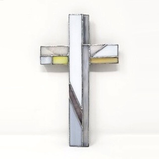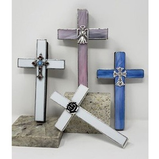 All of my cross designs are handmade and original. I use either wood or M.D.F. base and cut the glass to fit. Any of the designs can be made in colors of choice when the glass is available. All wall crosses have either a keyhole or a sawtooth mount for wall hanging.